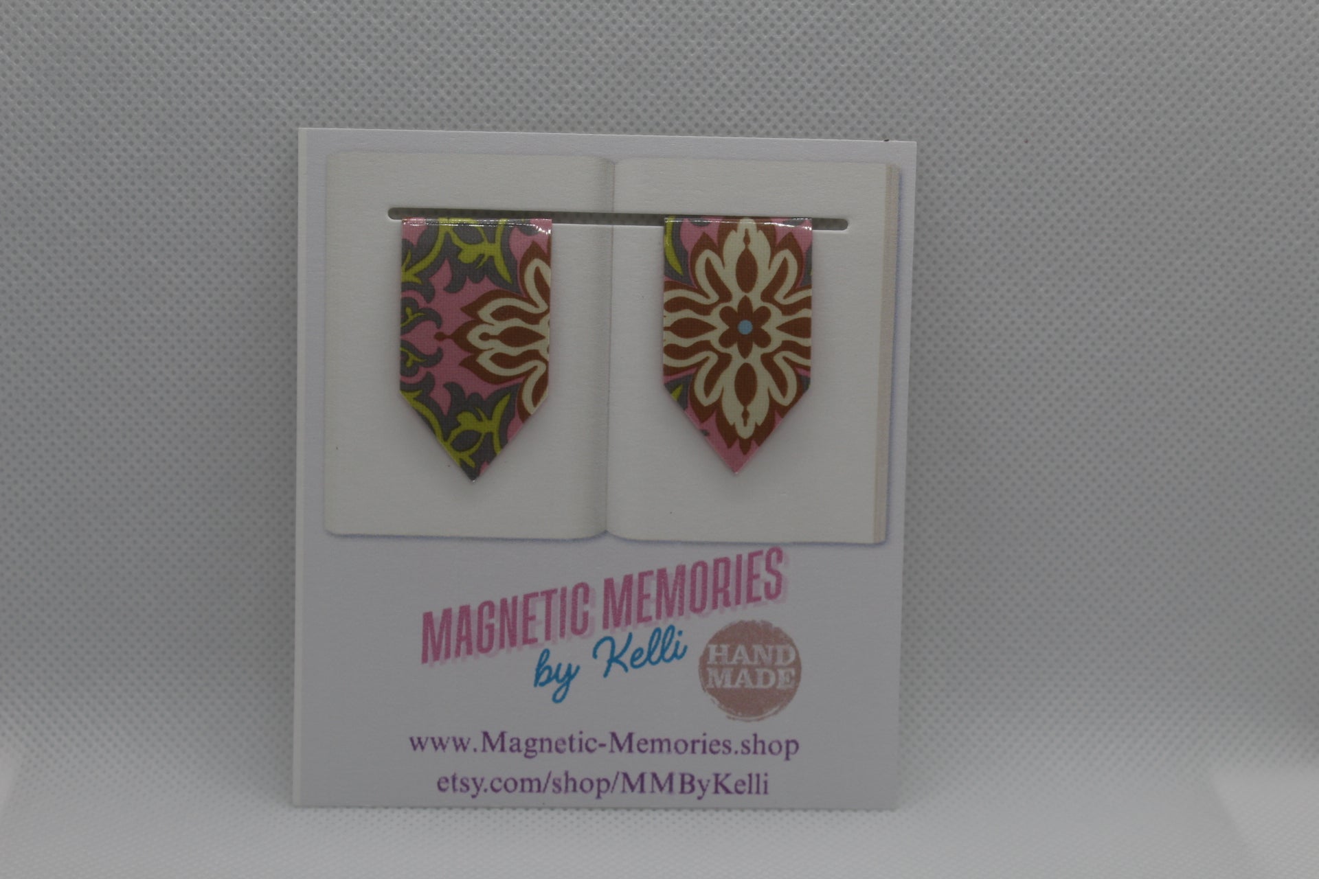 Elevate your reading and planning with our handmade magnetic bookmarks—crafted with designer paper, carefully laminated for durability, and precision-cut for a sleek finish. Each bookmark features strong, high-quality magnets that securely clip to your pages without slipping or damaging your paper. Whether you're marking your spot in a book or using them as stylish bookmark bullets in planners or journals, these bookmarks combine functionality with eye-catching design. A perfect blend of beauty and practicality for readers, writers, and organizers alike.